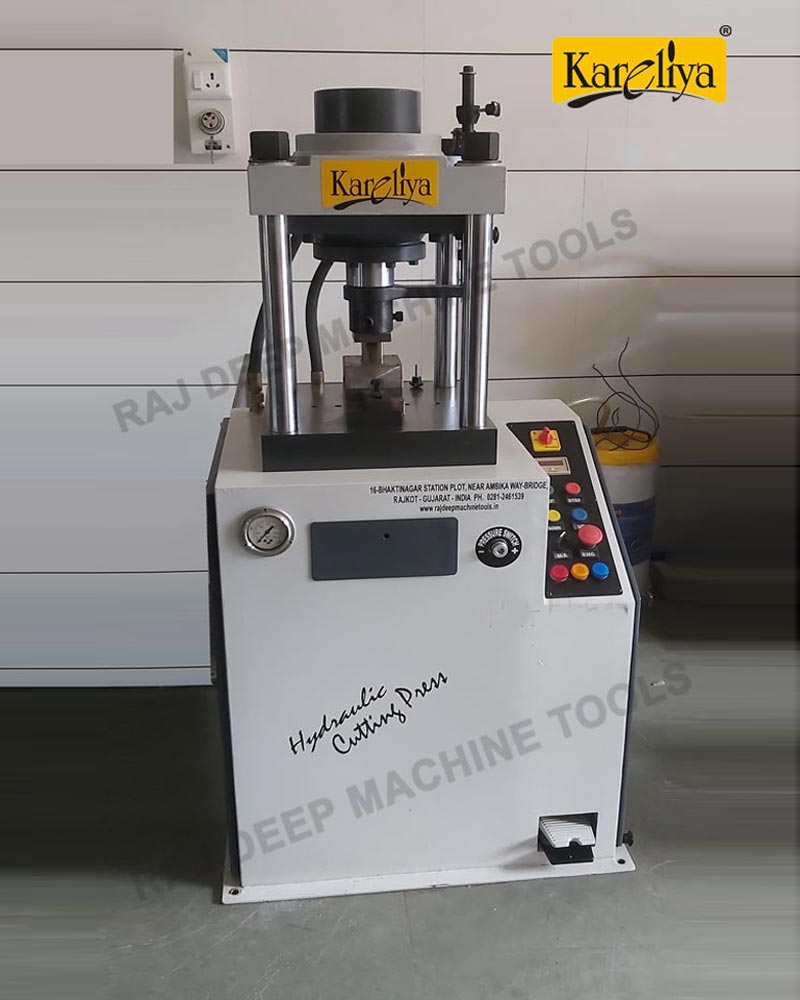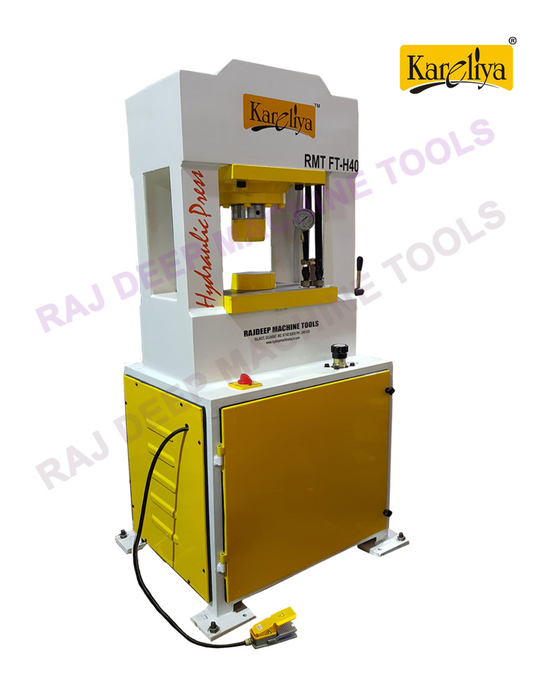 Rajdeep Machine & Tools (RMT) We are Kareliya BrandHydraulic Press Machine H 40 Ton Semi Automatic Model with Control Panel and Foot operated Switch This hydraulic Coining Press can be operated through the control panel board or manually with foot pedals and has the provision to adjust the final coining pressure. A timer is provided to adjust the time for which the pressure remains applied before return stroke. Our standard version Hydraulic Coining Press is available in four multipal models: 20 Tons, 25 Tons, 30 Tons, 40 Tons, 50 Tons, 60 Tons, 80 Tons, 100 Tons, 200 Tons and 250 Tons Capacity.